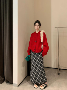 2025新年红色软糯纽扣开衫毛衣女秋冬新款宽松慵懒百搭针织外套潮