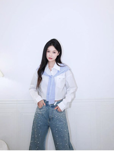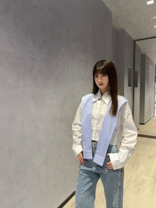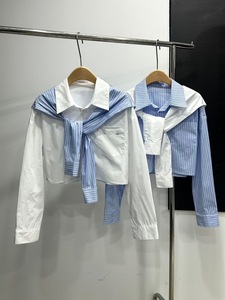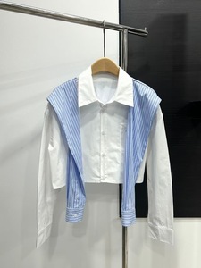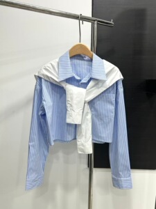 南油ann25秋季新款衬衫条纹两件套短款长袖设计师披肩衬衣字母