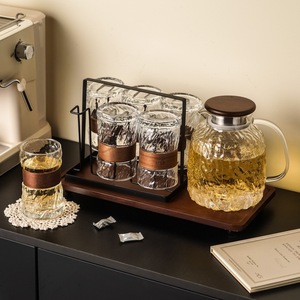 树纹透明水具套装1壶6杯配黑色杯架+托盘