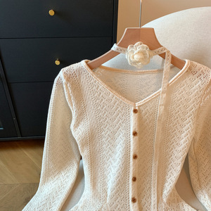 新款韩系简约喇叭袖上衣百搭温柔气质长袖配花朵飘带法式针织秋季