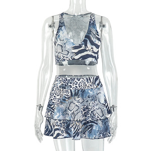 欧美风ins跨境夏季度假印花时尚裙套装V领露脐半身裙两件套女装潮