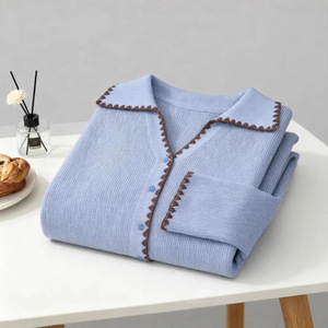 061秋冬蓝色设计感v领开衫毛衣大码显瘦上衣女花边宝石扣