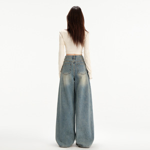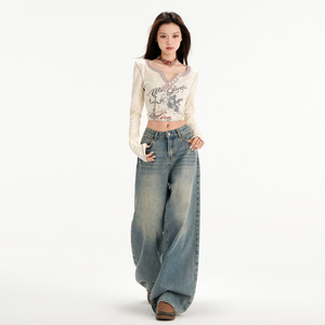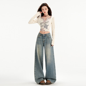 【今茵】美式复古水洗做旧宽松直筒垂感百搭阔腿牛仔长裤拖地裤女