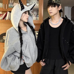 美式复古高级感灰色廓形连帽卫衣男女宽松百搭猫耳朵外套上衣情侣