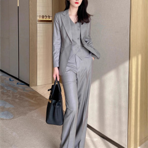 预售干练浅灰色精品毛料西装马甲直筒裤职业套装OL通勤会议正装女