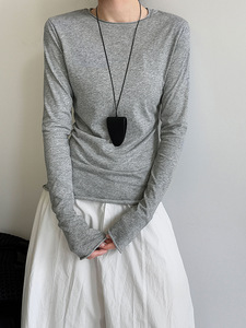 鹿西 韩系百搭卷边圆领T恤打底衫女秋季新款长袖内搭修身上衣2013