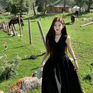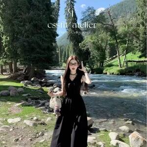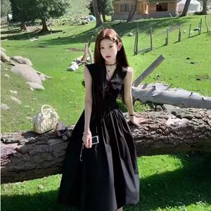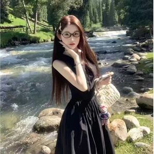 夏季法式赫本翻领收腰无袖连衣裙2025年高级新款黑色长裙气质