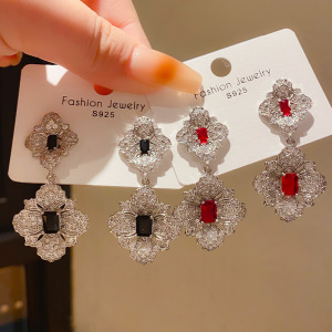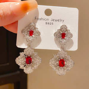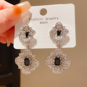 银针复古轻奢锆石几何方形花朵耳环民族风气质小众高级感个性耳饰