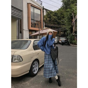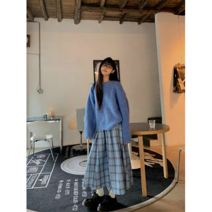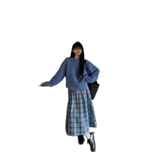 韩系百搭甜美纯色圆领长袖毛针织衫春秋新款格纹毛呢半身裙套装女