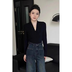 法式高级感黑色正肩V领长袖T恤女秋冬季气质百搭褶皱收腰针织上衣