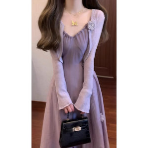 夏装搭配一整套大码胖mm紫色开衫吊带连衣裙气质温柔高级套装裙女