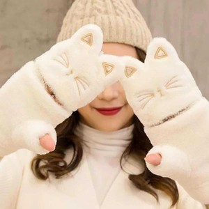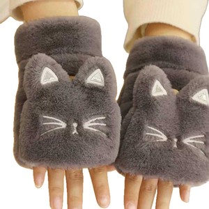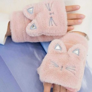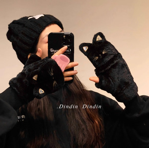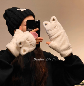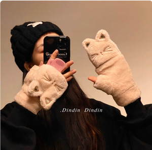 秋冬新款毛绒卡通手套可爱学生翻盖半指写字手套加绒加厚软萌猫咪