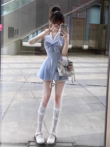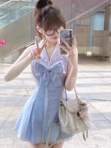 甜美蝴蝶结条纹连衣裙子女夏季法式初恋公主蓬蓬裙收腰小个子短裙
