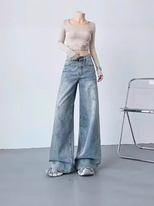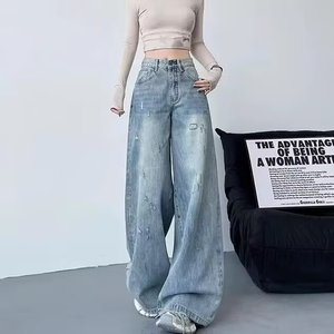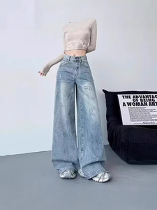 复古水洗磨破阔腿牛仔裤女春秋大码胖mm高腰宽松垂感直筒拖地裤子