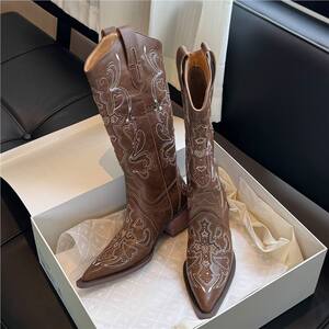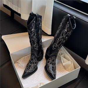 现货款】夏天靴子美拉德棕色尖头水钻长筒靴废土风新疆西部牛仔靴