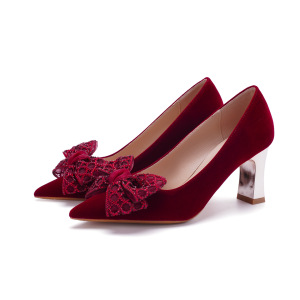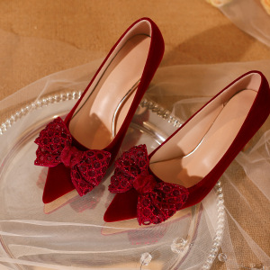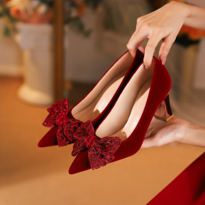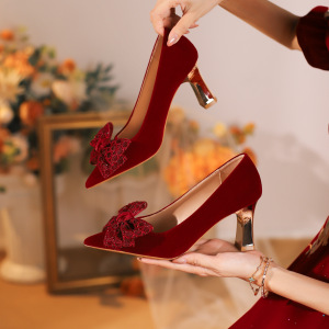【Y-919-26】红色婚鞋女加宽加肥尖头粗跟秀禾新娘鞋胖脚大码女鞋