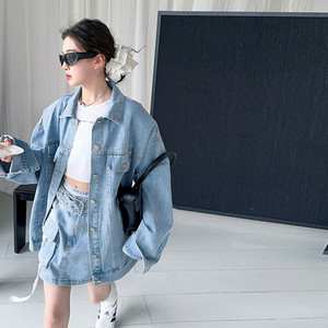 2025年新款时尚港风外套半身裙两件套春秋季短款辣妹牛仔套装大童