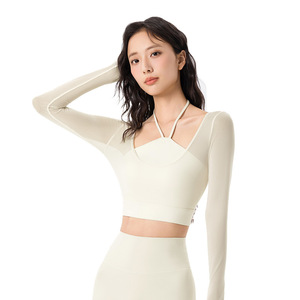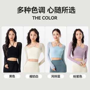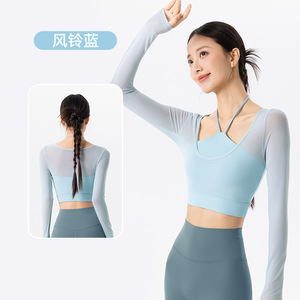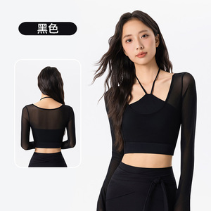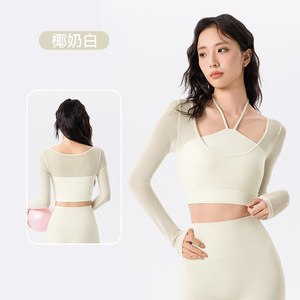跨境网纱假两件瑜伽服长袖女带胸垫修身显瘦挂脖短款运动健身上衣