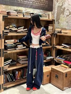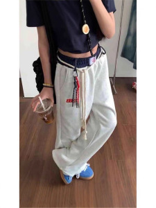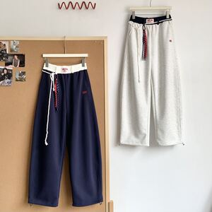 jennie同款小标绑带撞色腰可束脚直筒裤女秋季新款宽松情侣休闲裤