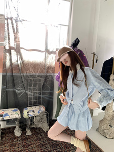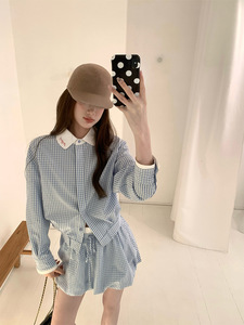 aaaaxbbb 冷调锡蓝 蓝格子套装翻领衬衫花苞裙短裙撞色系带上衣女
