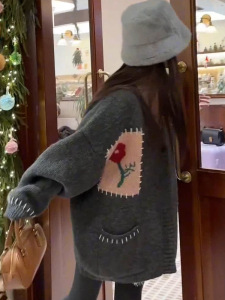 美式复古提花针织开衫女2025秋冬时尚宽松百搭补丁设计感上衣外套