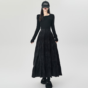 现货2025丝绒蛋糕半身裙女春秋肌理感大摆裙高腰褶皱中长款伞裙子