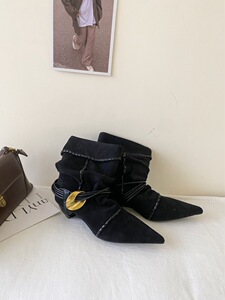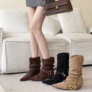 尖头磨砂短靴女真皮增高褶皱两穿小众麂皮复古猫跟西部牛仔堆堆靴