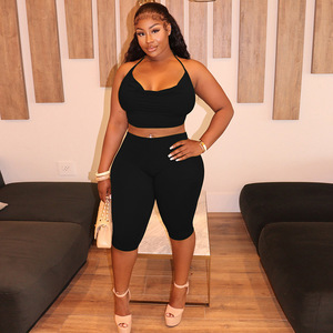 J25ST244欧美风跨境女装春夏挂脖后背绑带露脐纯色包臀七分裤套装