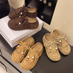 谷韵丨袋鼠勃肯鞋女秋季2025新款软底平底系带休闲流苏豆豆单鞋女
