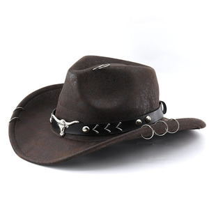 欧美外贸麂皮绒牛仔礼帽牛头配饰民族风复古爵士帽毡帽西部牛仔帽