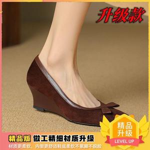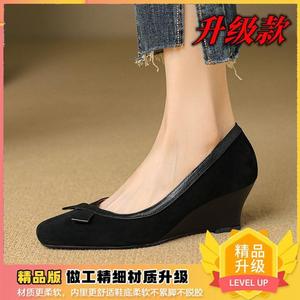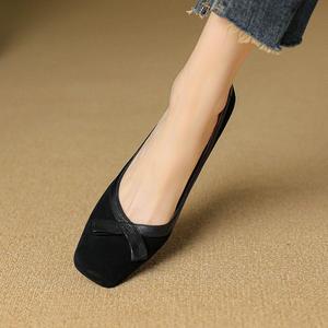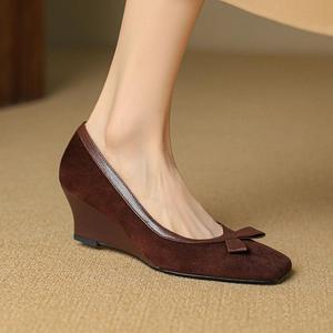 法式蝴蝶结浅口复古方头单鞋2025春秋新款磨砂坡跟时尚高跟鞋