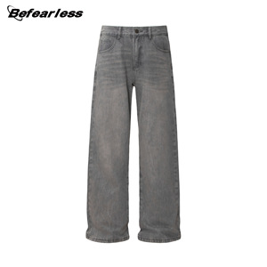 14.2oz纯棉水洗高订灰微喇牛仔裤复古宽松阔腿拖地休闲直筒长裤潮
