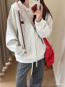 016 慵懒风连帽卫衣女秋季新款撞色刺绣字母女士开衫拉链外套宽松