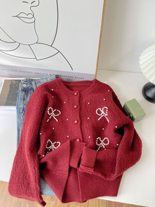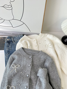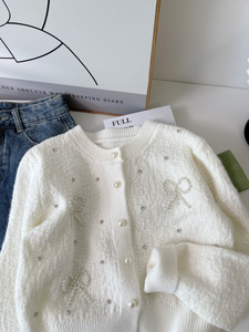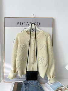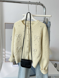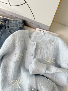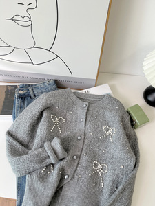 小香风灰色钉珠蝴蝶结毛衣女早春千金风miu系穿搭针织开衫6136