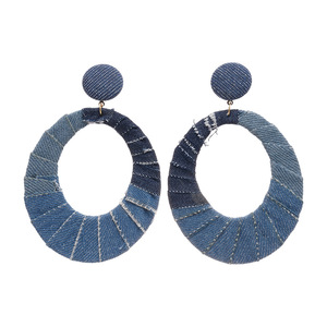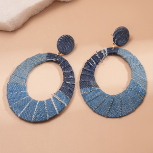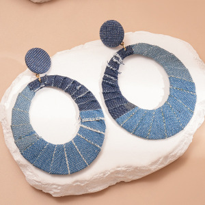 欧美跨境布艺牛仔镂空椭圆形银针耳环复古夸张个性小众高级感耳饰