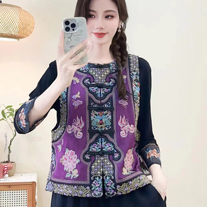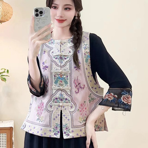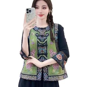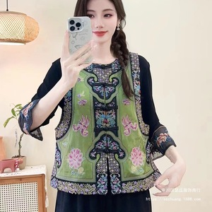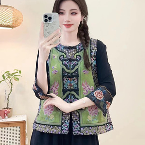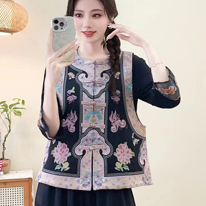 马甲女民族风刺绣坎肩秋季盘扣撞色宽松马夹2025新款圆领复古背心