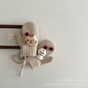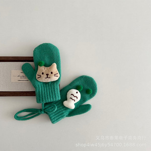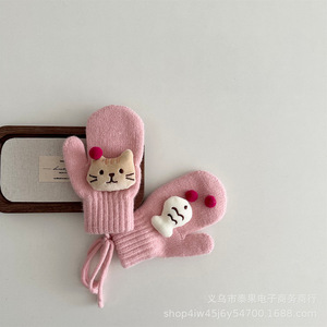 韩版宝宝卡通玩偶新款纯色包头连指手套冬季保暖幼童挂脖针织手套