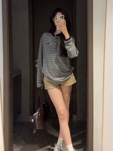 早秋新款灰色条纹情侣POLO衫2025春秋宽松中长款潮牌女款翻领长袖