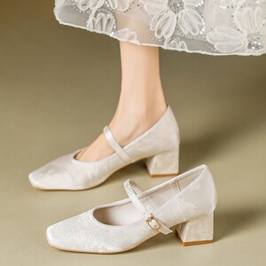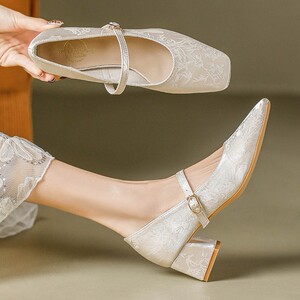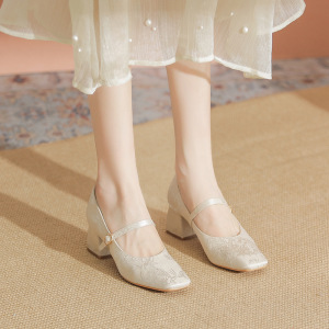 国风新中式单鞋女配旗袍汉服珍珠绸缎刺绣花朵不掉跟方头玛丽珍鞋