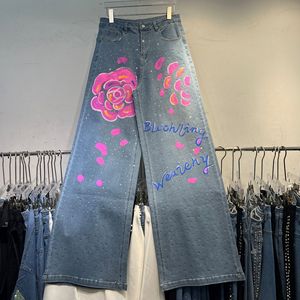 小众设计感手绘粉色花牛仔裤女重工烫钻时尚宽松直筒阔腿长裤