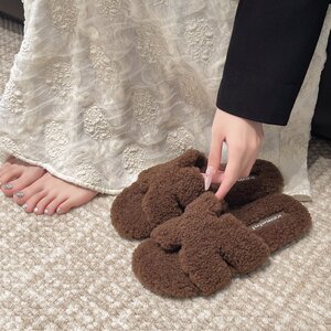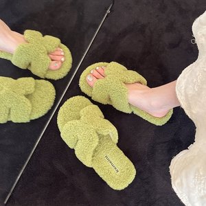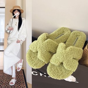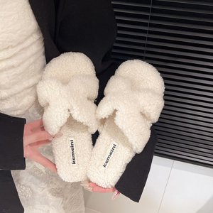 2025年秋冬季新款网红纯色毛毛拖鞋女外穿平底羊羔毛时尚一字拖