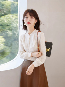 哥家商场同款女装2025秋季荷叶边长袖内搭上衣法式蕾丝设计感衬衫