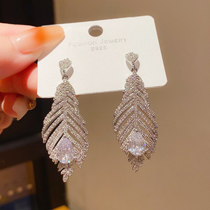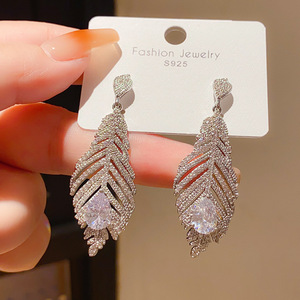 银针轻奢锆石镶钻水滴羽毛形耳环小众高级感冷淡风复古精致耳饰女