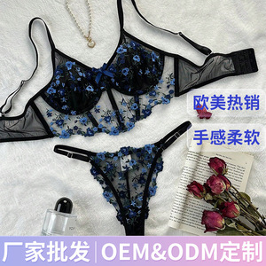 欧美花色网纱性惑文胸套装透气可调节细丁字裤刺绣三扣吊带23164