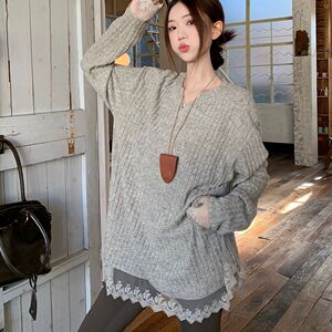 大码设计感蕾丝拼接vV领针织衫女秋冬季宽松显瘦磨毛加厚保暖毛衣