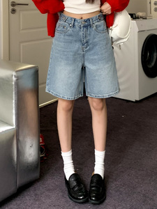橘子树在哪儿美式复古蓝色牛仔五分裤女春夏小众直筒百搭显瘦中裤