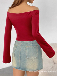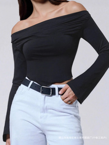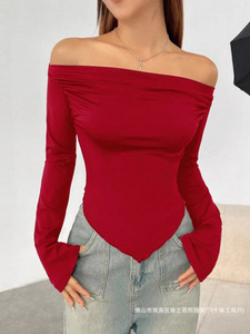 【跨境批发】不规则修身长袖打底衫T恤女纯欲设计感修身露肩上衣