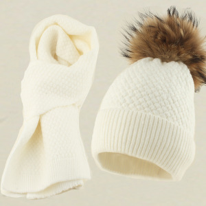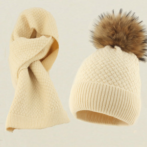 2025秋冬新款女款真貉子毛球帽子围巾套装成人针织两件套保暖户外