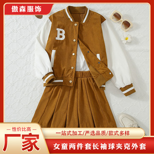 长袖棒球夹克纽扣外套褶皱短裙字母印花学院风休闲儿童两件套