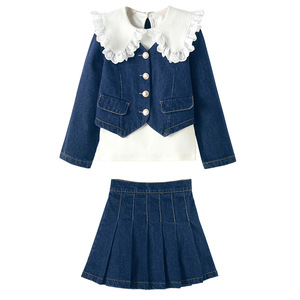 女童套装秋装新款韩版大童时尚洋气反领牛仔外套百褶裙打底衫